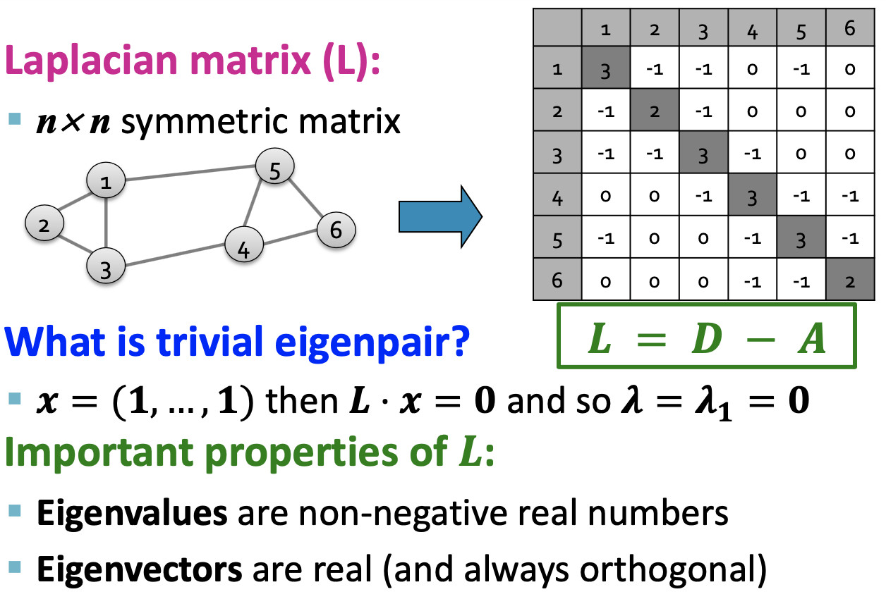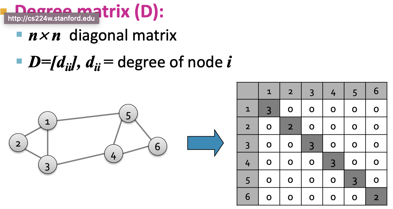 이 때 Laplacian matrix 는 L = D - A로 표현할 수 있습니다.