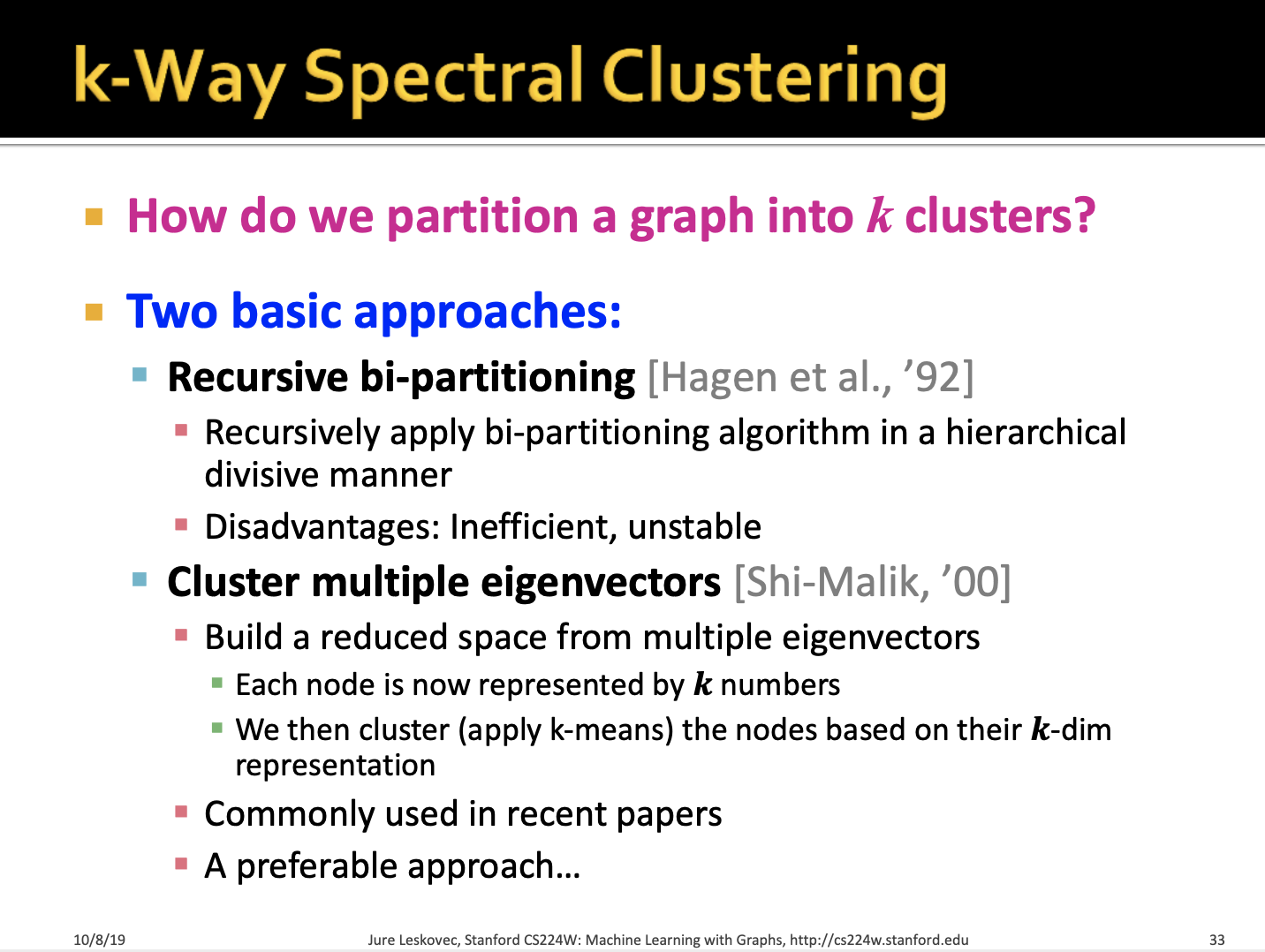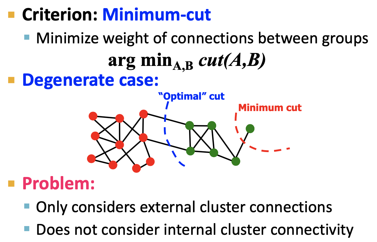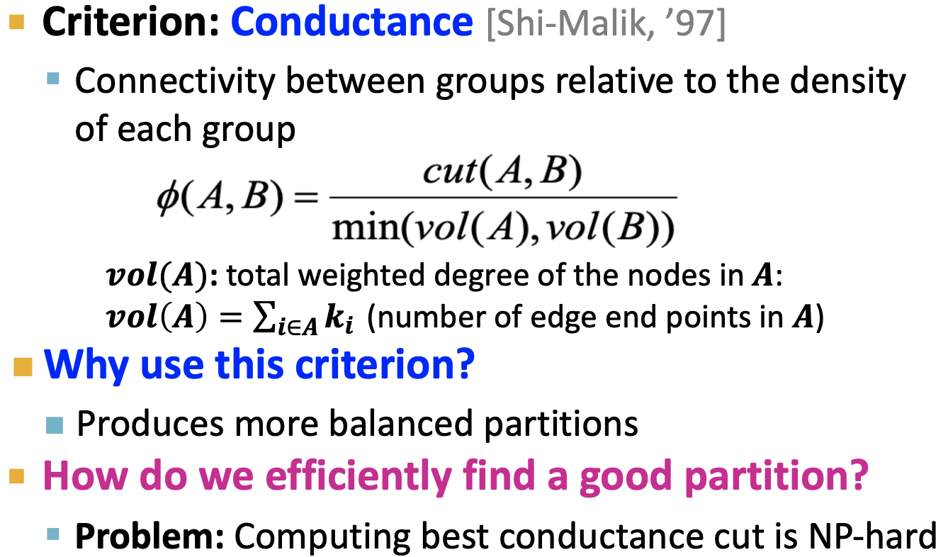 - cluster 바깥의 연결에만 주목하고, 내부적인 것은 고려하지 않는 문제점이 있음 -> Conductance로 해결
