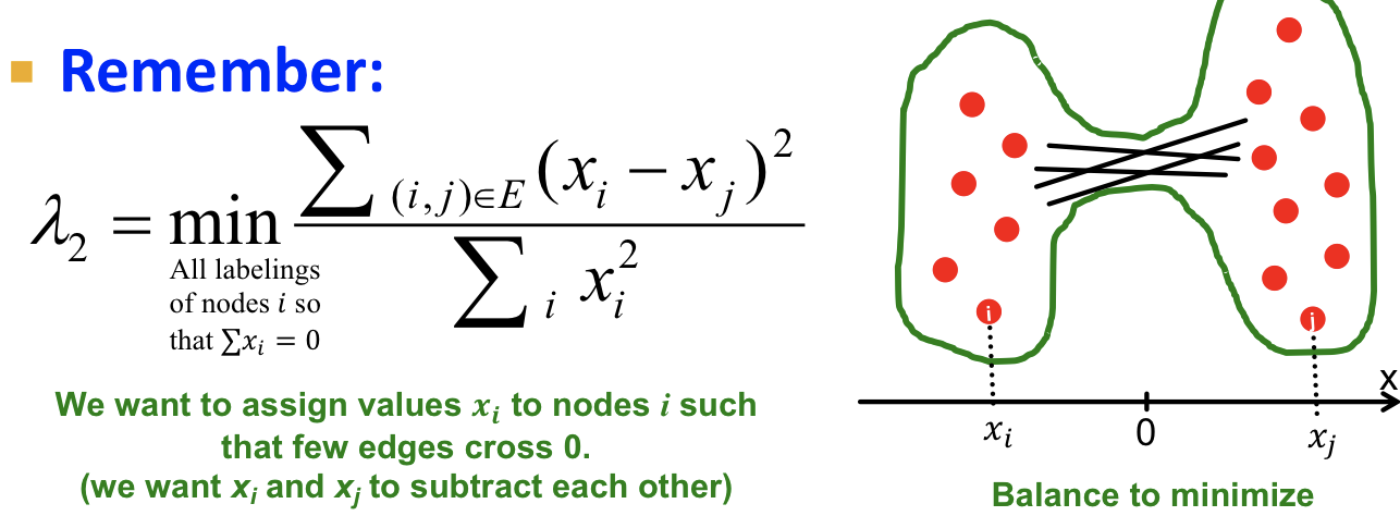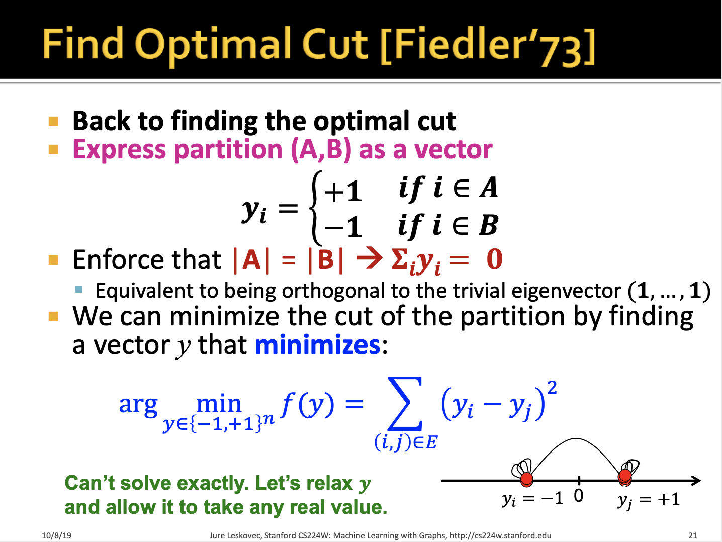 노드간의 차 (y_i - y_j)^2 을 최소화 시켜야 최적의 cut을 찾을 수 있는데 laplacian matrix L의 lambda2가 저 f(y)의 최소값이 되고, 최소화하는 벡터 y는 eigenvector(x)가 됩니다.