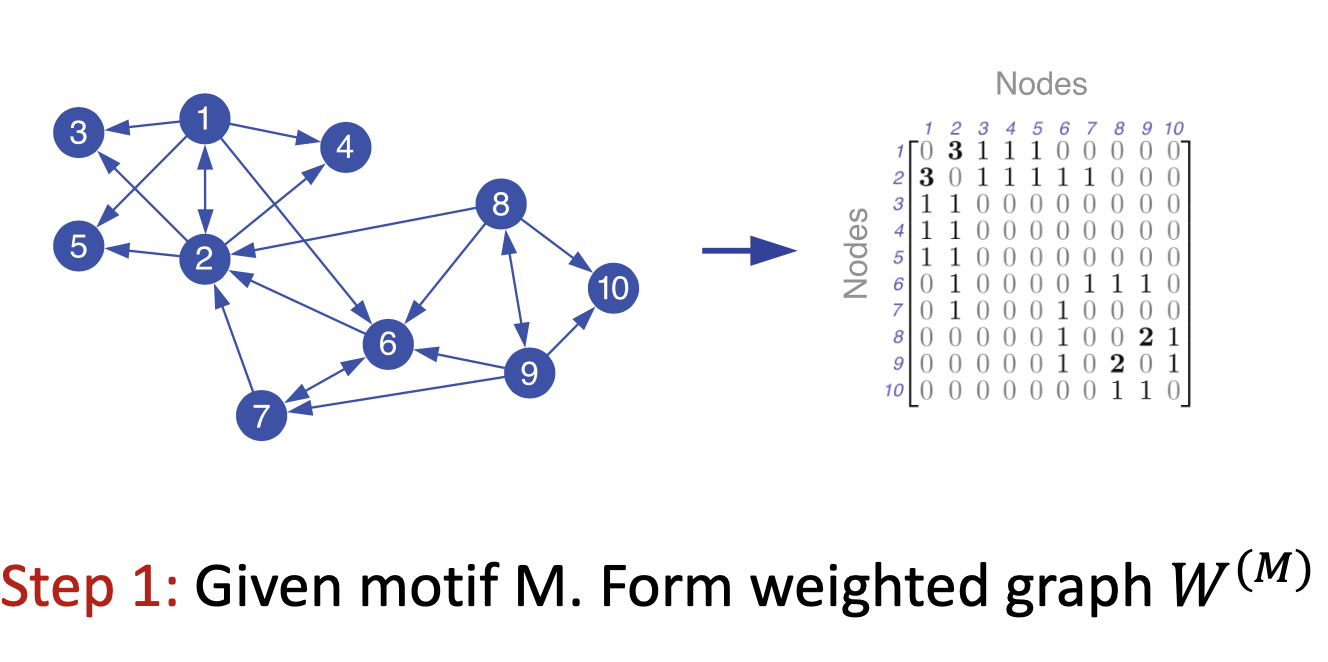 1. 주어진 그래프G 에서 motif M이 나타나는 edge의 수로 wighted graph W를 만듭니다.