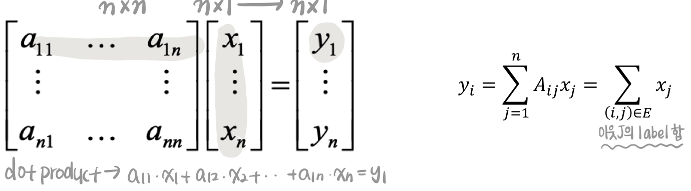 - A·X 의 j 번째 요소는 j의 이웃의 x-value 합이며, node j 에 대해 새로운 x-value 값을 만들었습니다.