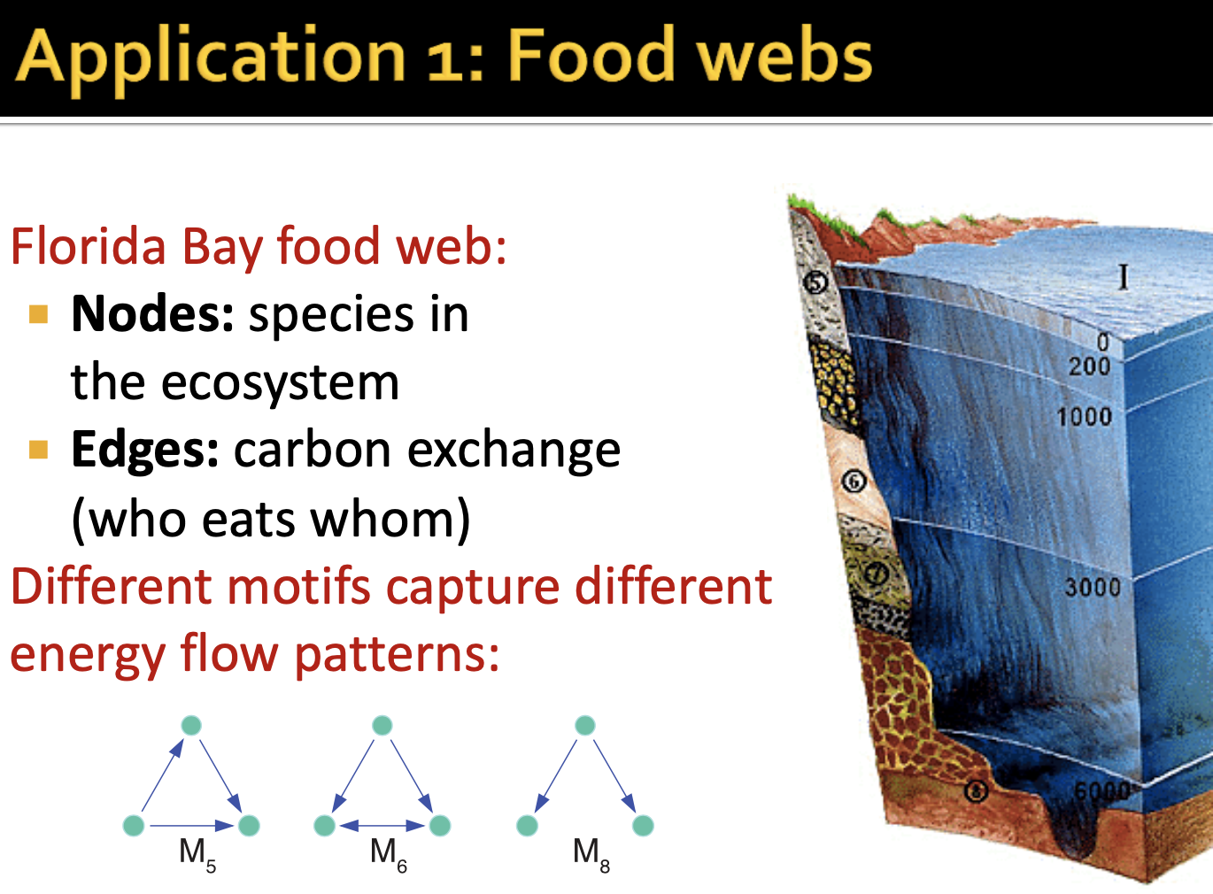예시로 다음과 같은 먹이 그물 네트워크를 들 수 있다. 각 노드들은 환경시스템의 종이고, edge는 누구를 잡아 먹는가(carbon exchange)이다. 다른 모양의 motif들이 있다고 가정한다. (M5, M6m M8)