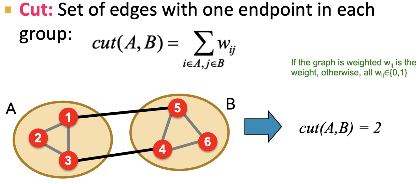 - Cut : 각 그룹에서 end point가 있는 edge들의 집합 (그림이 이해가 쉽습니다.)