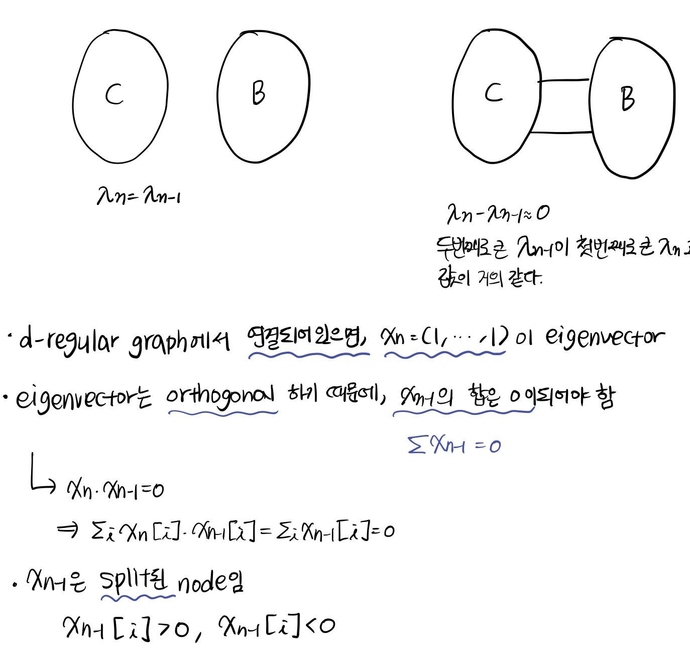 그래프 G가 위와 같이 C vs B 로 나뉘는 경우를 가정한다면, 다음과 같은 특징들이 있다고 합니다. (eigenvector의 orthogonal함 이용, 증명 생략)