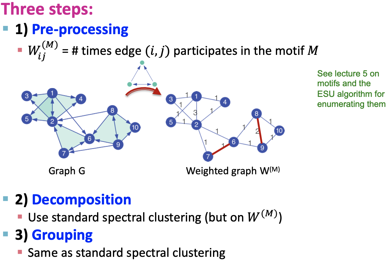 input으로 그래프 G와 모티프 M을 넣고 -> G를 이용해서 새로운 weighed graph W를 만들어서 사용합니다. -> W에 Spectral clustering을 진행해서 -> output으로 cluster가 나옵니다.