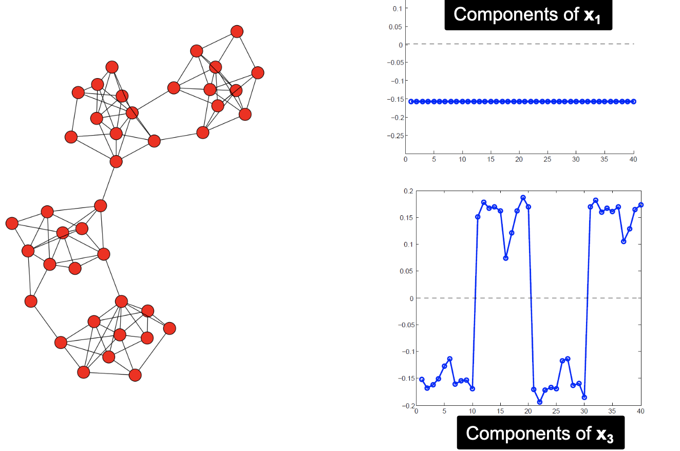 - Spectrum : 그래프의 eigenvectors x(i)는 eigenvalues lambda(i)의 크기 순으로 정렬됩니다. (오름차 순)