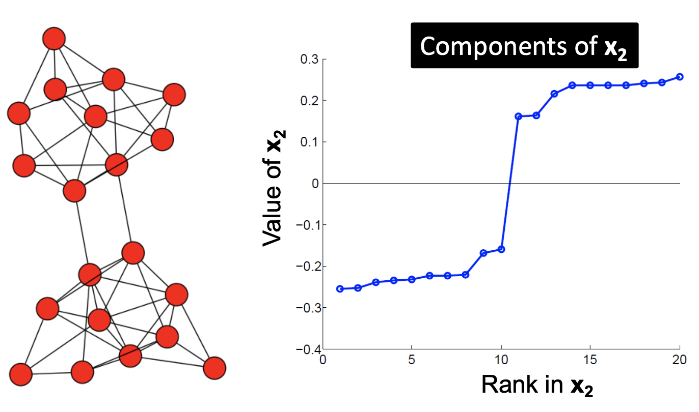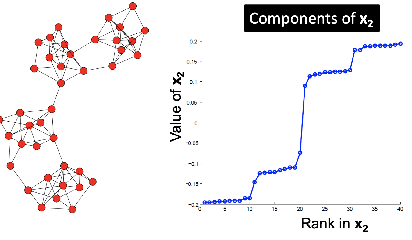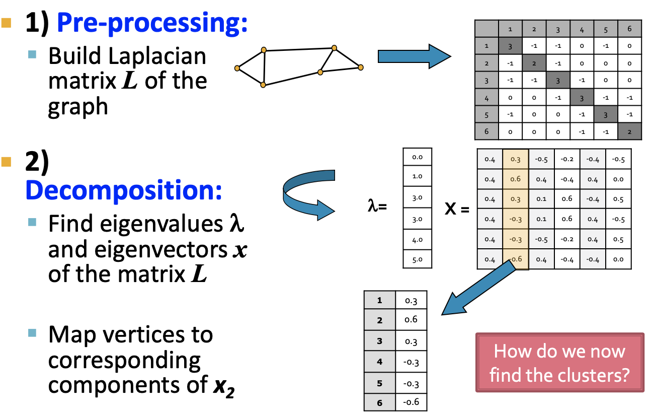 다음과 같이 고차원의 인접행렬을 고유벡터와 고유값으로 저차원의 행렬로 매핑시켜버린 후에, 양수와 음수를 나눠서 clustering 해버렸습니다.
