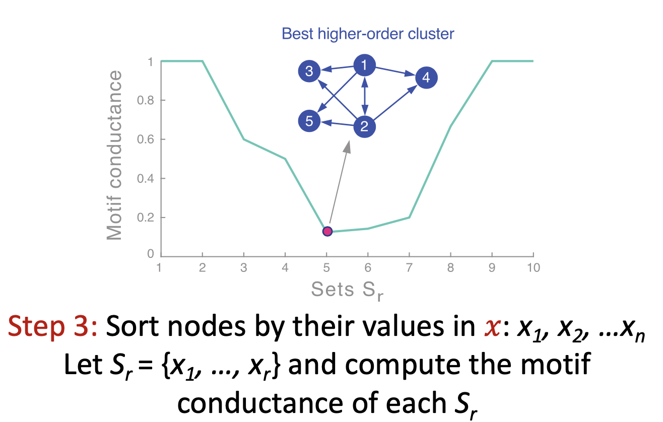 3. x 값을 sort 해서 plot한다. x축을 각 S 집합으로 두고 y축을 motif conductance로 둬서 conductance를 최소화하는 값을 찾는다. 멈출 위치를 정하려면 결국 휴리스틱한 접근을 해야한다. (위의 예시가 아주 잘 나온 경우라고 한다.)