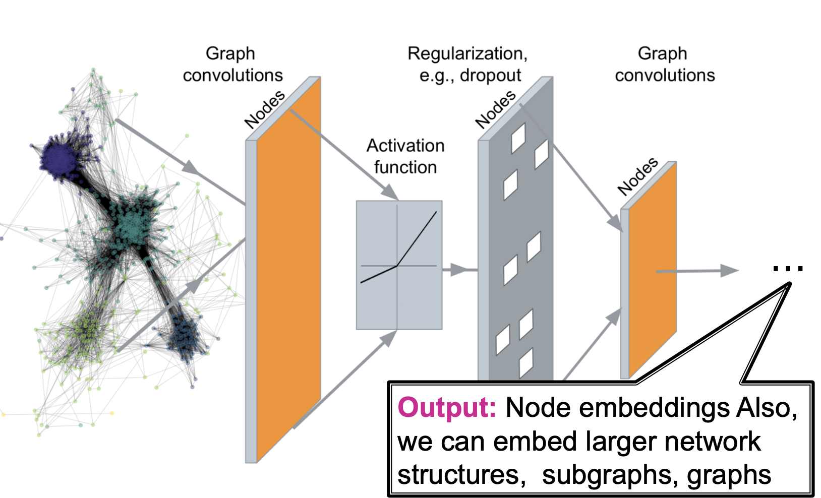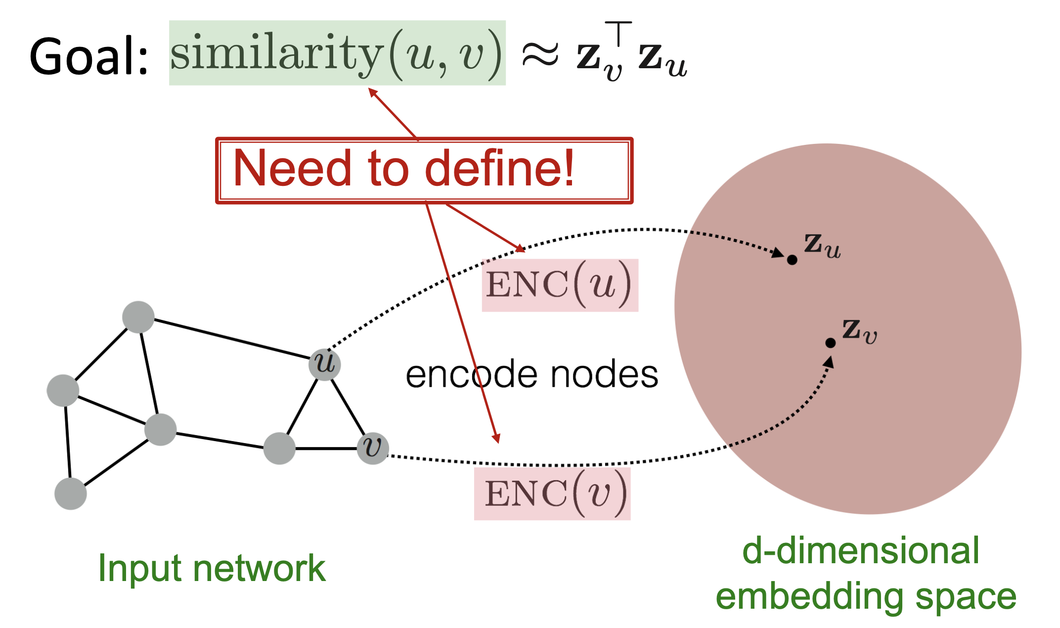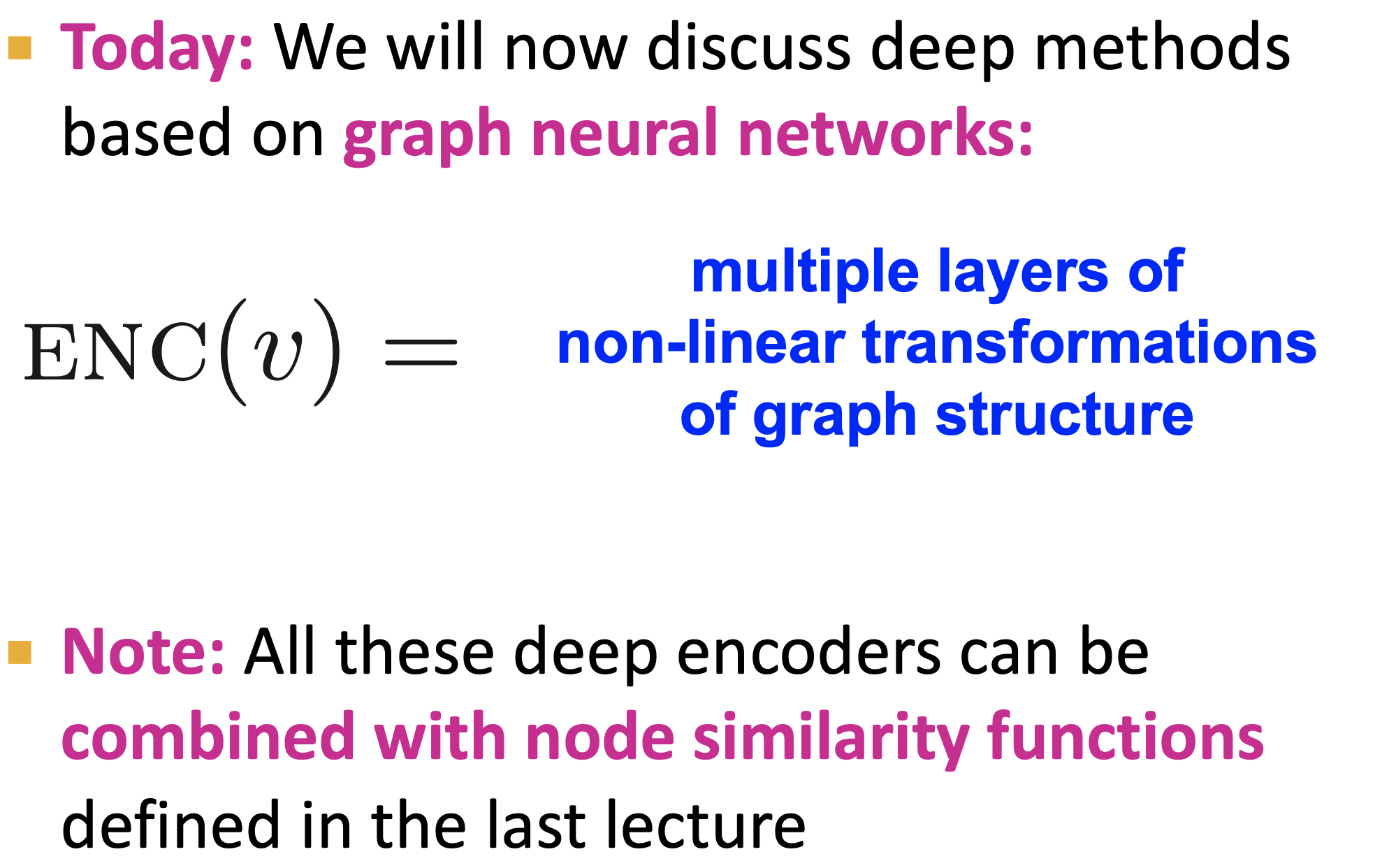 먼저 7강에서 node embedding에 대해서 배웠습니다. 본래의 network node u와 v 사이의 관계를 가장 잘 표현 하는 embedding 값을 찾는 것이 핵심이었습니다 이 때 그래프를 임베딩 벡터로 잘 찾아주는 encoder ENC(・)를 잘 만드는 것이 목표인데, 오늘은 이 Encoder 역할을 Neural Network 에게 시켜서 해결할 것입니다.