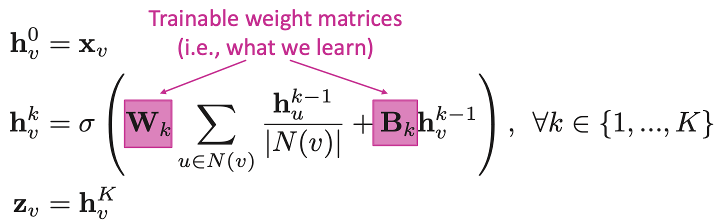위의 수식에서 W,B가 학습이 필요한 weight 파라미터 였습니다. W는 이웃 노드들로부터 집계한 정보에 대한 가중치, B는 지금 보고 있는 노드의 이전 레이어에서의 임베딩 정보에 대한 가중치이기 때문에 이를 조절함으로써 이웃정보에 집중할지, 자신의 own property에 주목할지가 결정됩니다. 따라서 이 가중치를 학습시키는 수식은 다음과 같습니다.