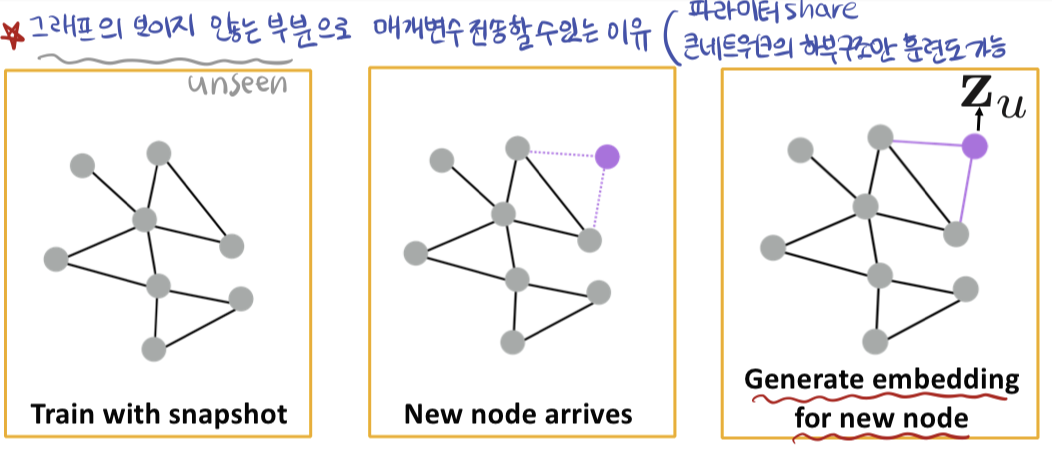 따라서 한가지 그래프에 대해서 학습을 하고, node embedding하는 법을 배워서 새로운 그래프에 대해서 일반화 시킬 수 있습니다.