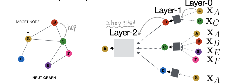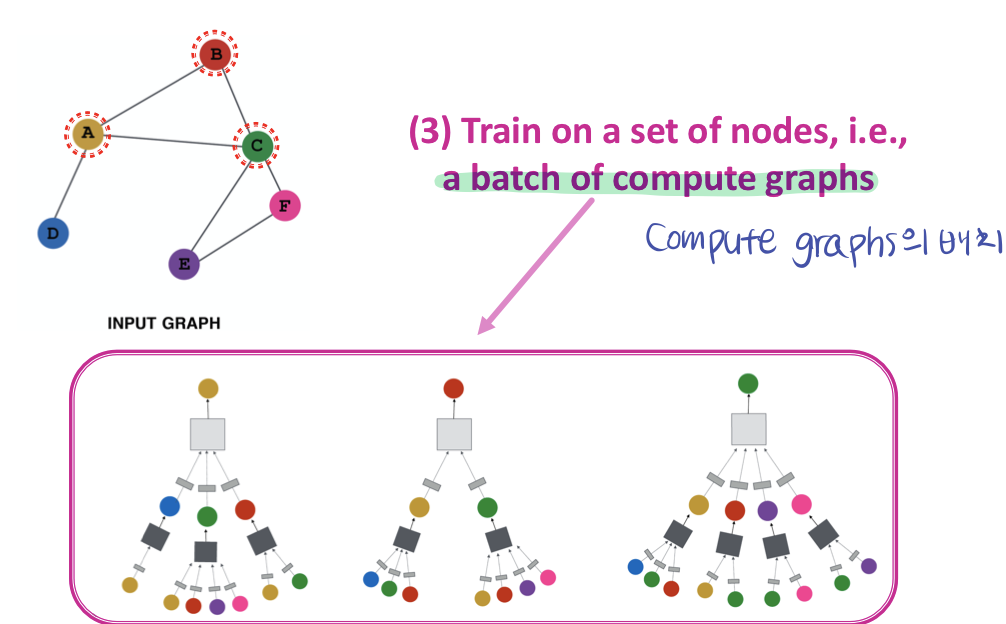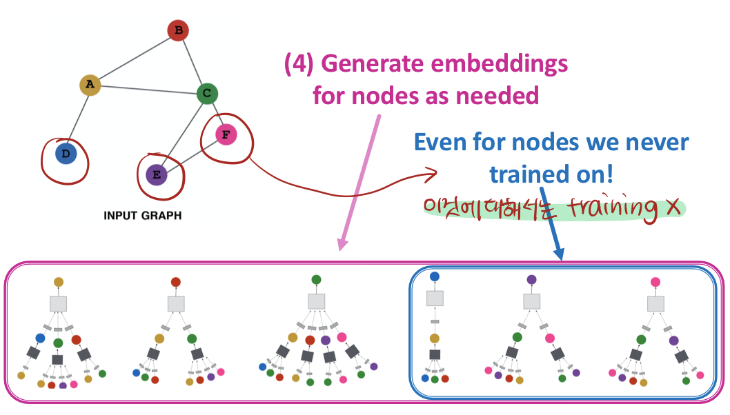 - 모든 노드들이 자기만의 Neural Network Architecture를 갖고 있으며, 각자의 neighborhood에 근거해서 computiation graph를 정의합니다. (그림)