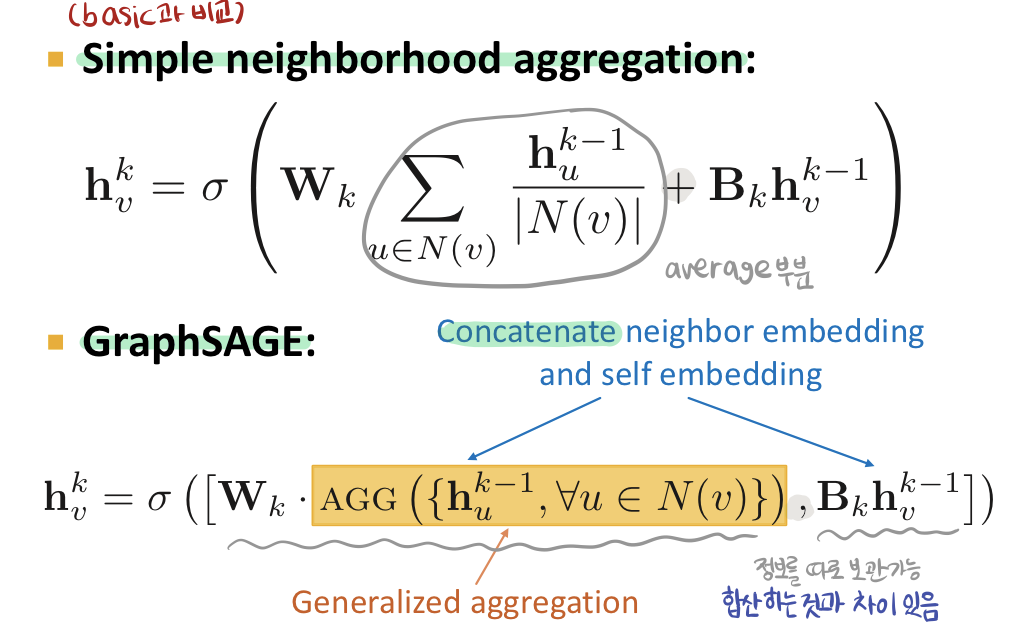 앞서 살펴봤던 SImple neighborhood aggregation과 GraphSAGE를 비교하면 위와 같습니다. 단순 average가 아니라 다양한 AGG(집계함수)를 사용할 것이고, 이를 자신에 대한 정보를 단순 합산하는 것이 아니라 Concat합니다. 이는 자신에 대한 정보를 따로 보관한다는 의미입니다.