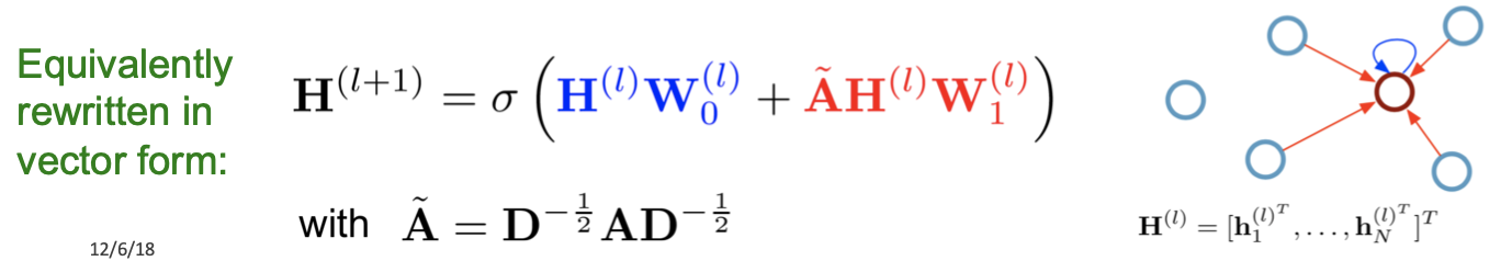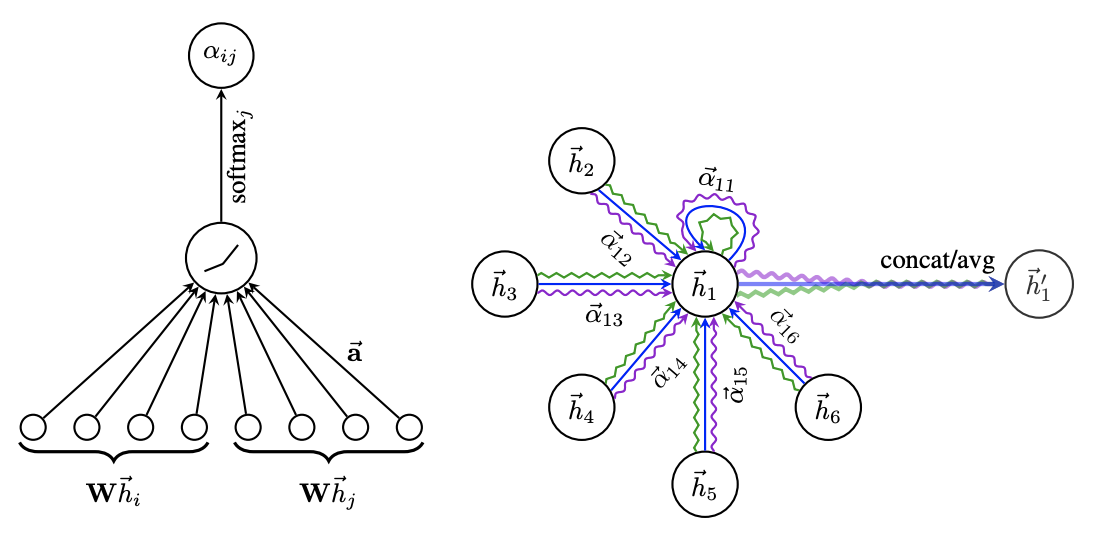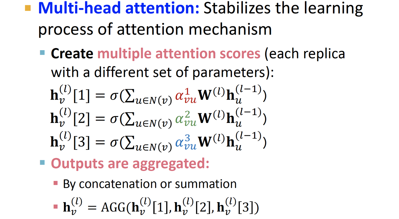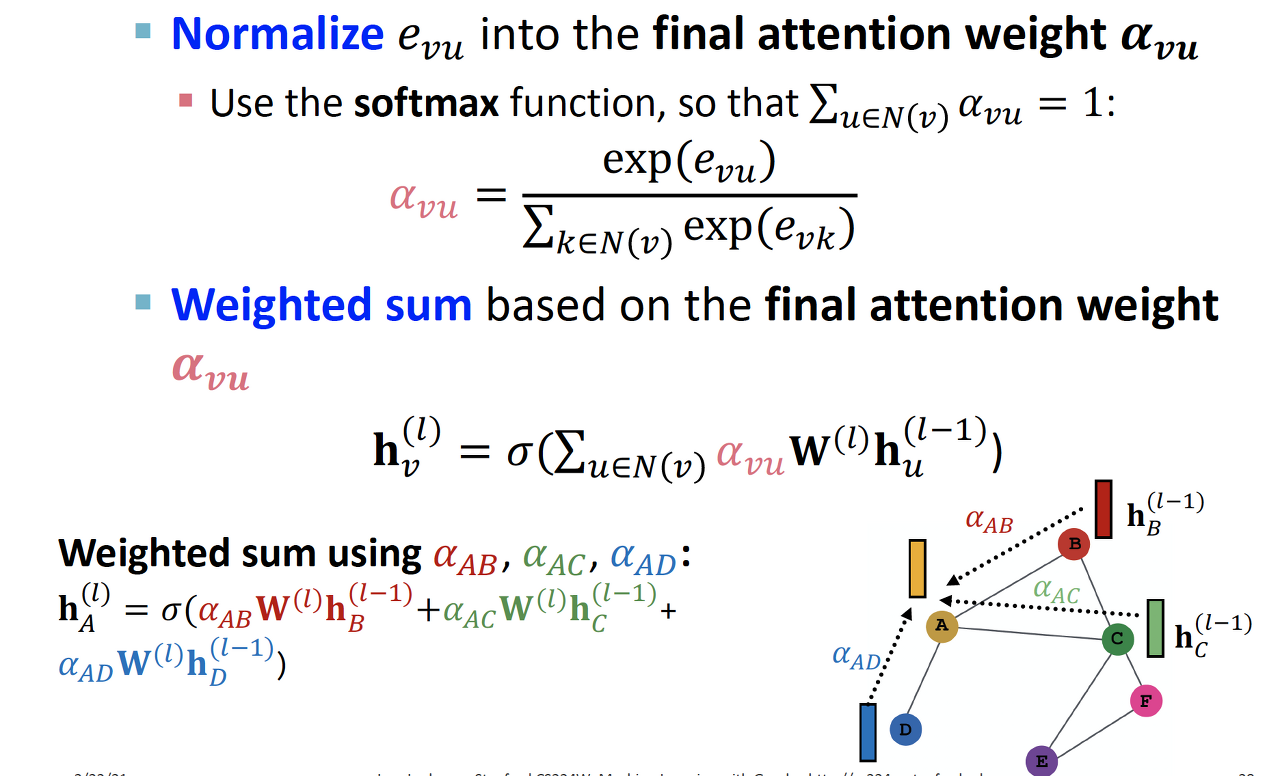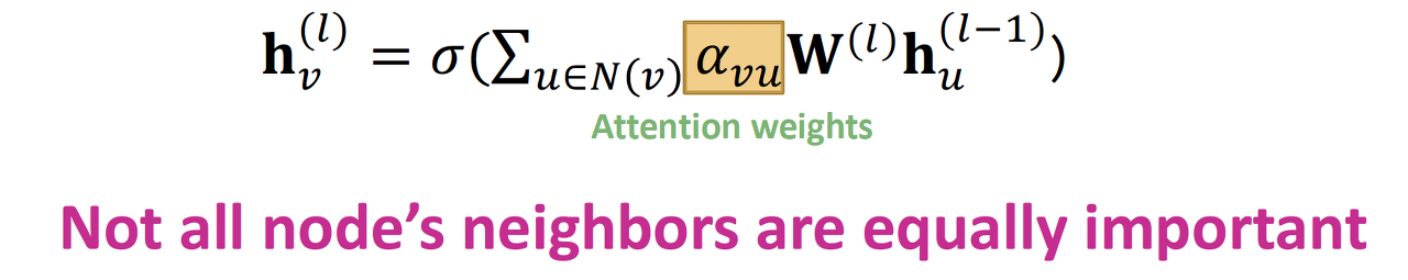 이렇게 하면 위의 h_v를 simple 방법과 비교했을때, 이웃을 집계하고 있는 것은 동일하지만 a_vu를 사용해서 weight를 다르게 주고 있다는 것을 알 수 있습니다.