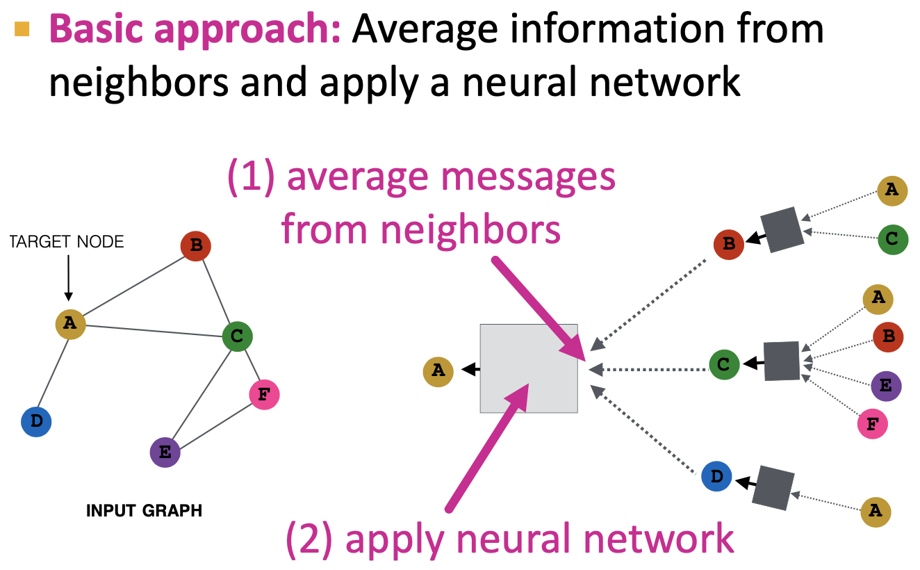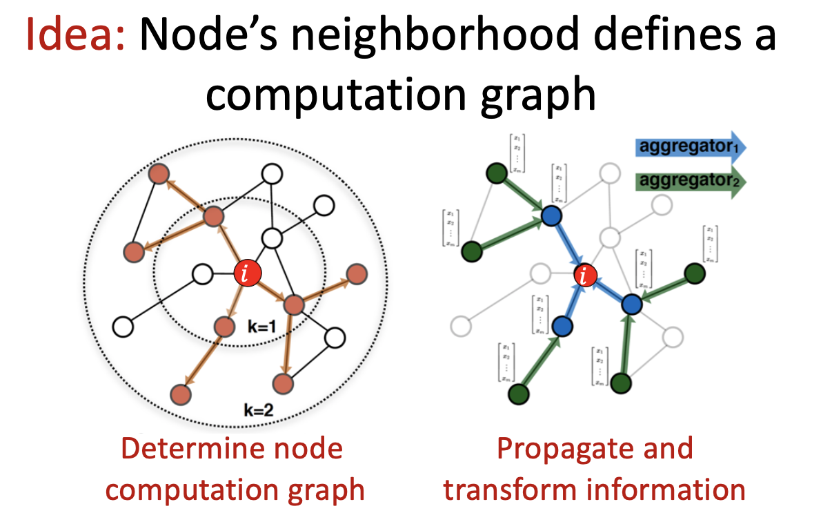핵심 아이디어는 "node의 이웃이 계산된 그래프를 결정한다" 입니다. node feature를 계산하기 위해서 그래프 전반에 걸쳐서 정보를 전파하는 법을 배우는 것입니다.