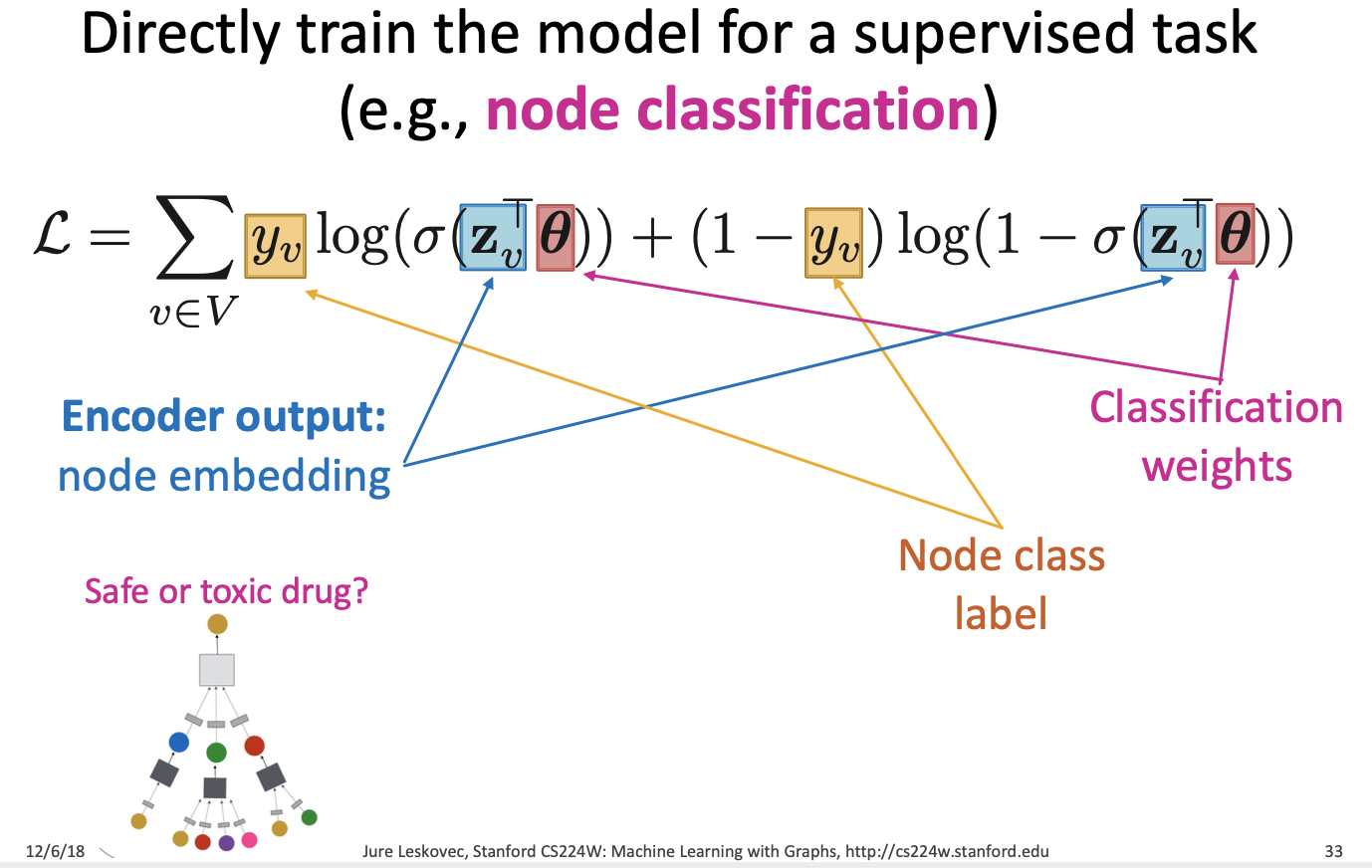 약물 네트워크에서 A 약물이 안전한지 독인지 판단하는 node classification, 이 때 이 node classification은 위와 같은 cross-entropy loss function을 사용하는 Supervised Training을 수행합니다.
