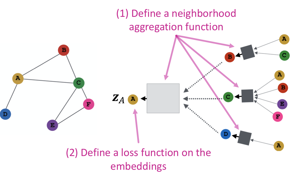 - 노드 정보를 집계하는데, neural networks를 사용해서 이웃들로 부터 정보를 aggregate(집계)합니다.