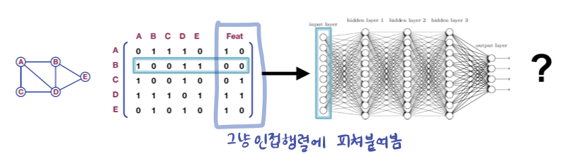 가장 단순한 접근은 그래프의 adjacency matrix를 feature vector와 concat 해서 Deep Neural Network에 input으로 넣는 방법입니다. 이 방법도 파라미터가 많고 다른 사이즈나 노드 순서가 달라지면 사용이 불가능해지기 때문에 문제 입니다. (사용하지 않습니다.)