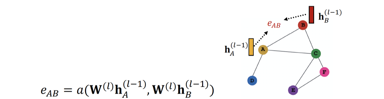 1. 노드 A, B에 대한 어텐션 계수는 e_AB로 나타냅니다. 노드 B -> 노드 A 일 때 중요도를 나타냅니다.