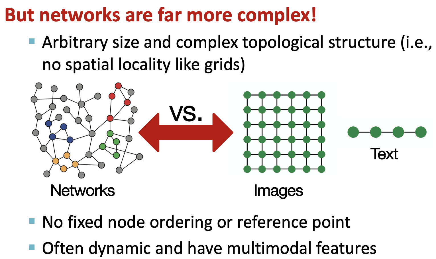 대강 왼쪽과 같은 프로세스로 처리 될텐데, 이 때 네트워크가 이미지 처럼 그리드 모양으로 표현되지도 않고, Text나 음성처럼 sequence적인 데이터도 아니여서 문제가 생깁니다. 그래프는 더 복잡한 구조를 가지고 있습니다.