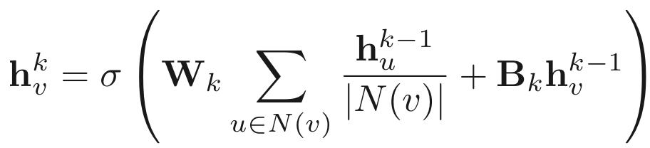 - h_v : v에 대한 embedding 값 -> [이웃에 대한 정보 집계 하는 부분] + [이전 레이어의 v에 대한 embedding 값]